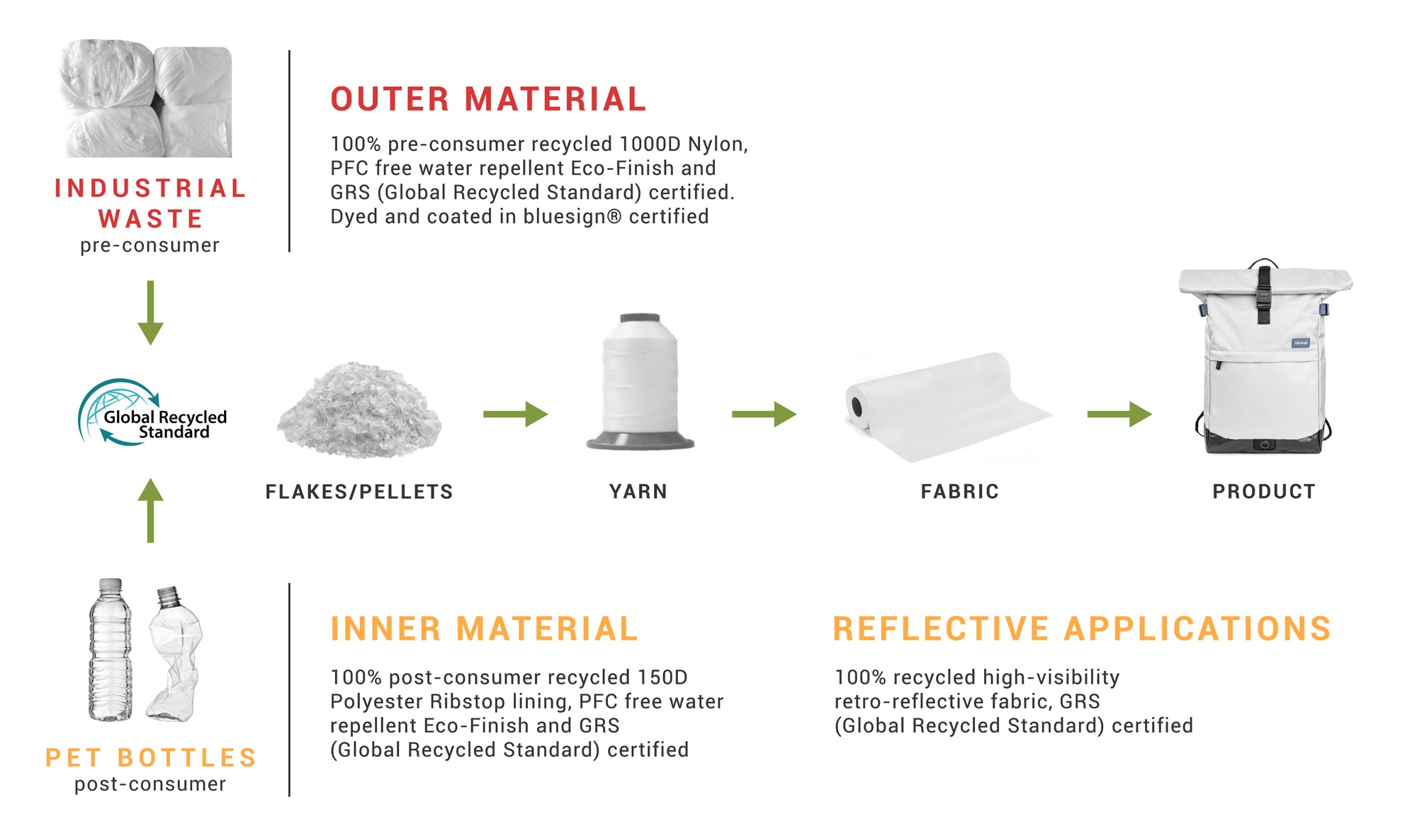 For our Creator's Collection and our Conversion backpacks, we use recycled PET made from plastic bottles.