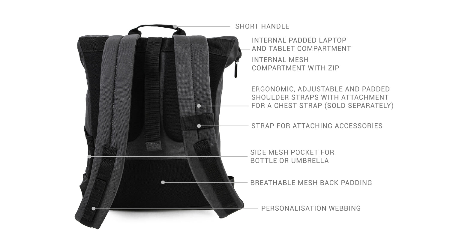 - Laptop compartment: 22.2 x 31.3 x 1.6 cm